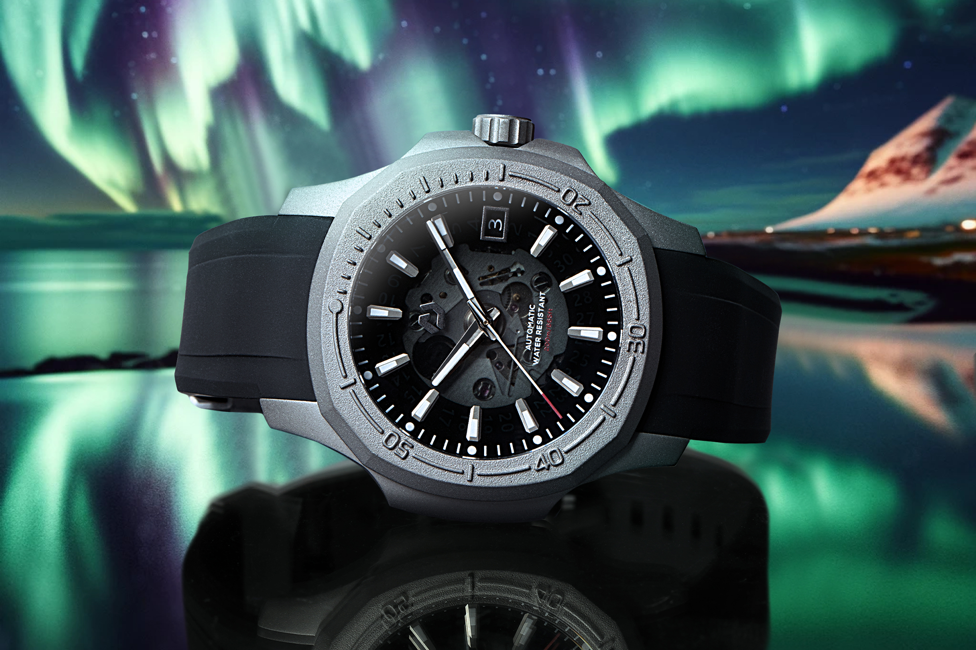 Crafted from durable stainless steel coated in titanium gray, the N200 boasts an alluring black fill dial with a translucent center, offering a peek into the watch's intricate calibre. The 3 o'clock date window adds practicality to its masterful creation.
